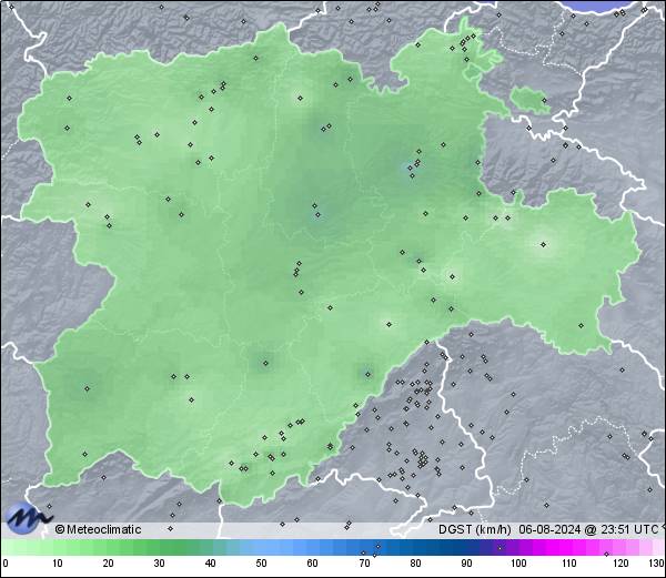 | 06-08-2024 | | | Máx. | Mín. | | | Temperatura | 30,3 | 10,5 | °C | | Humedad | 97 | 36 | % | | Viento | 32 | n/a | km/h | | Presión | 1.011 | 1.008 | hPa | | Precipitación | 0,2 | mm |