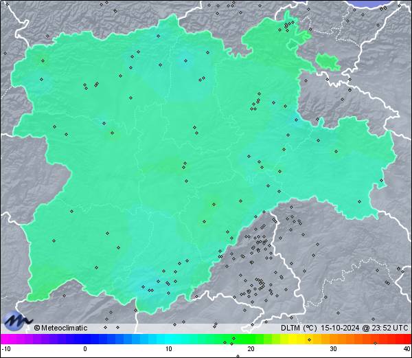 | 15-10-2024 | | | Máx. | Mín. | | | Temperatura | 18,2 | 13,3 | °C | | Humedad | 93 | 75 | % | | Viento | 35 | n/a | km/h | | Presión | 1.014 | 1.007 | hPa | | Precipitación | 0,5 | mm |
