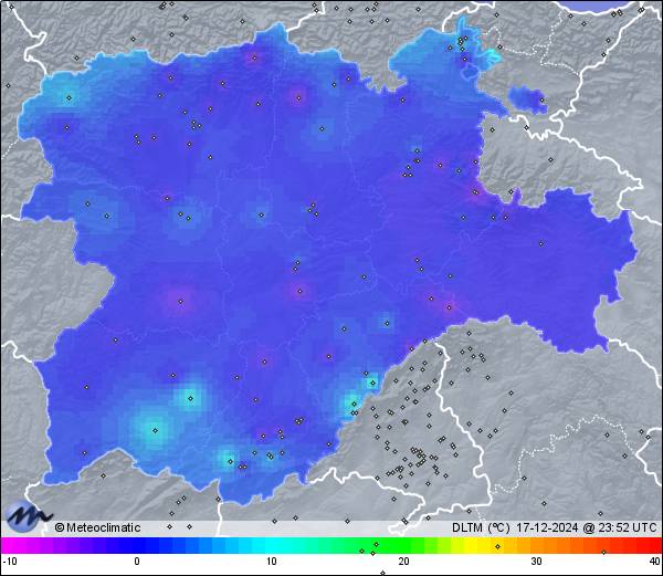 | 17-12-2024 | | | Máx. | Mín. | | | Temperatura | 9,0 | -1,2 | °C | | Humedad | 89 | 63 | % | | Viento | 5 | n/a | km/h | | Presión | 1.043 | 1.035 | hPa |