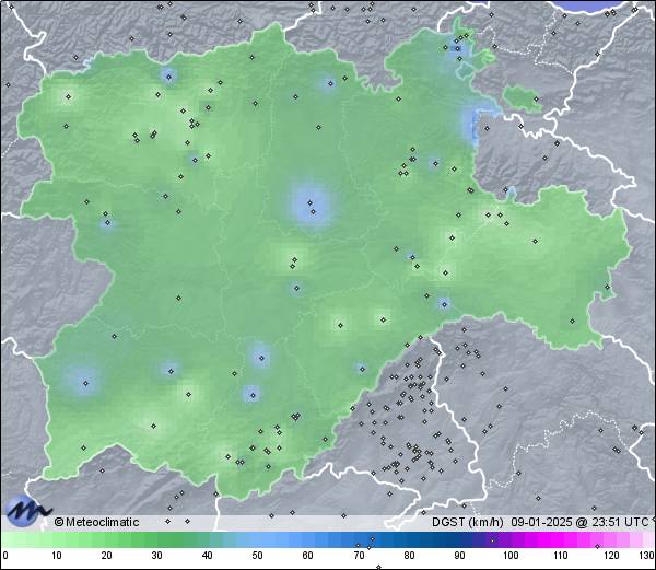 | 09-01-2025 | | | Máx. | Mín. | | | Temperatura | 12,6 | 5,9 | °C | | Humedad | 94 | 70 | % | | Viento | 36 | n/a | km/h | | Presión | 1.025 | 1.016 | hPa | | Precipitación | 0,0 | mm |