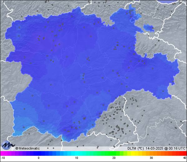 | 13-03-2025 | | | Máx. | Mín. | | | Temperatura | 6,3 | 6,0 | °C | | Humedad | 86 | 83 | % | | Presión | 1.000 | 1.000 | hPa | | Precipitación | 0,0 | mm |