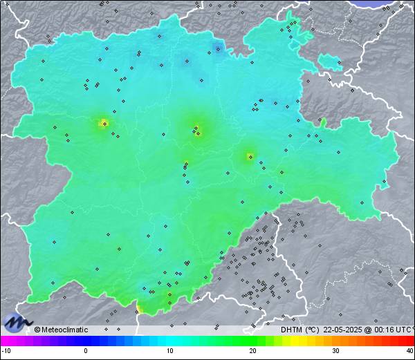 | 21-05-2025 | | | Máx. | Mín. | | | Temperatura | 24,1 | 9,4 | °C | | Humedad | 98 | 39 | % | | Viento | 22 | n/a | km/h | | Presión | 1.022 | 1.014 | hPa | | Precipitación | 0,0 | mm |