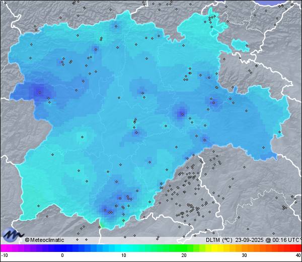 | 22-09-2025 | | | Máx. | Mín. | | | Temperatura | 6,7 | 5,8 | °C | | Humedad | 84 | 80 | % | | Viento | 15 | n/a | km/h | | Presión | 1.022 | 1.021 | hPa | | Precipitación | 0,0 | mm |