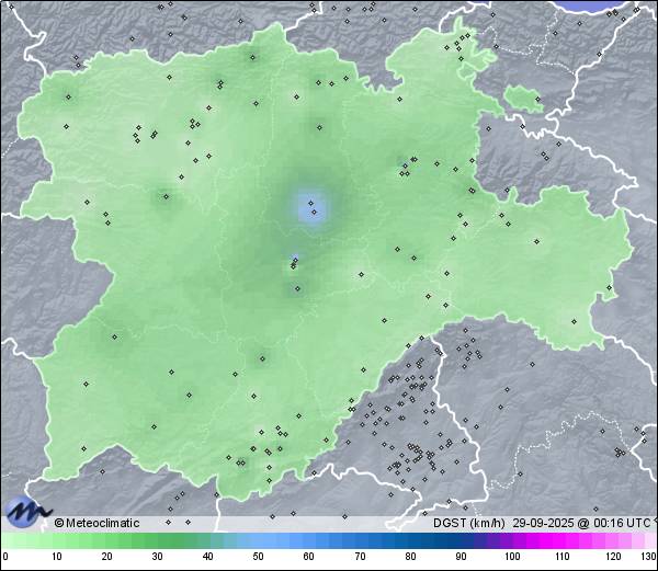 | 28-09-2025 | | | Máx. | Mín. | | | Temperatura | 18,7 | 8,6 | °C | | Humedad | 89 | 39 | % | | Viento | 44 | n/a | km/h | | Presión | 1.024 | 1.017 | hPa | | Precipitación | 0,0 | mm |