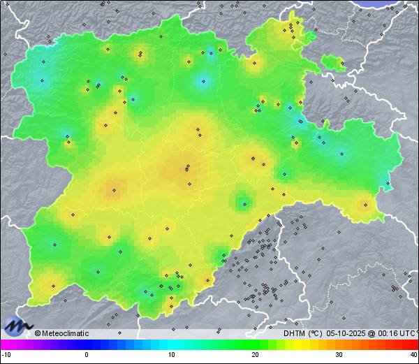 04-10-2025 | | Máx. | Mín. | | Temperatura | 25,1 | 5,1 | °C | Humedad | 97 | 45 | % | Viento | 18 | n/a | km/h | Presión | 1.022 | 1.017 | hPa | Precipitación | 0,0 | mm |