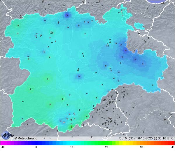 | 15-10-2025 | | | Máx. | Mín. | | | Temperatura | 21,9 | -0,7 | °C | | Humedad | 95 | 41 | % | | Viento | 3 | n/a | km/h | | Presión | 1.020 | 1.019 | hPa | | Precipitación | 0,0 | mm |