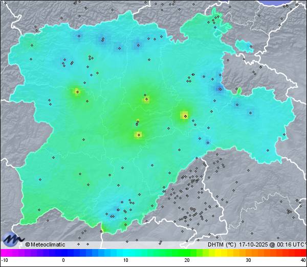 | 16-10-2025 | | | Máx. | Mín. | | | Temperatura | 21,8 | -0,9 | °C | | Humedad | 95 | 45 | % | | Viento | 5 | n/a | km/h | | Presión | 1.021 | 1.019 | hPa | | Precipitación | 0,0 | mm |