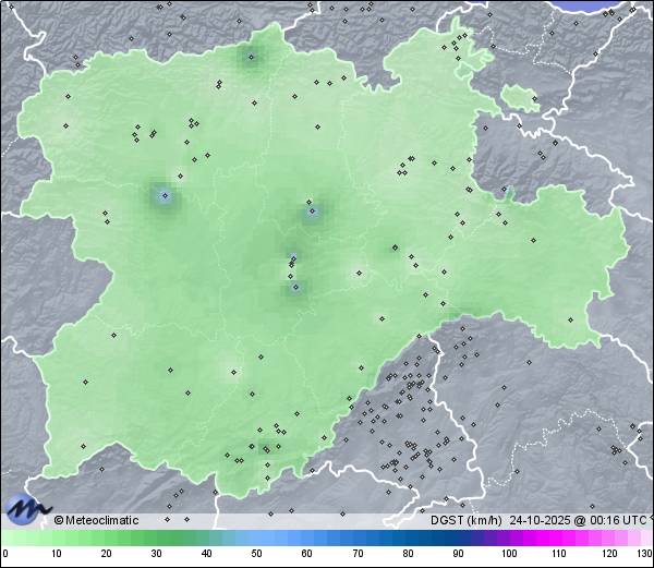 | 23-10-2025 | | | Máx. | Mín. | | | Temperatura | 16,1 | 5,6 | °C | | Humedad | 95 | 40 | % | | Viento | 60 | n/a | km/h | | Presión | 1.017 | 1.011 | hPa | | Precipitación | 3,8 | mm |
