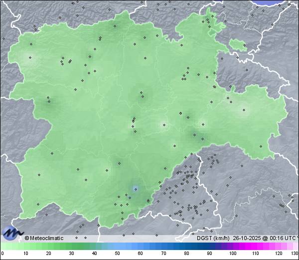 | 25-10-2025 | | | Máx. | Mín. | | | Temperatura | 13,5 | 7,8 | °C | | Humedad | 99 | 81 | % | | Viento | 35 | n/a | km/h | | Presión | 1.022 | 1.015 | hPa | | Precipitación | 0,0 | mm |