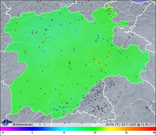 | Actualizado: 12:17 UTC | 17,9°C 46% | 18,7 °C / 92% | | -1,1°C / 38% | | Calma | | 8 km/h | | 1.027 hPa |