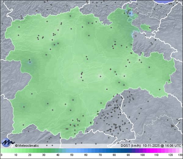 | Actualizado: 14:28 UTC | 10,5°C 94% | 10,9 °C / 99% | | 7,1°C / 88% | | 6 km/h ESE | | 45 km/h | | 1.020 hPa | | 0,3 mm |