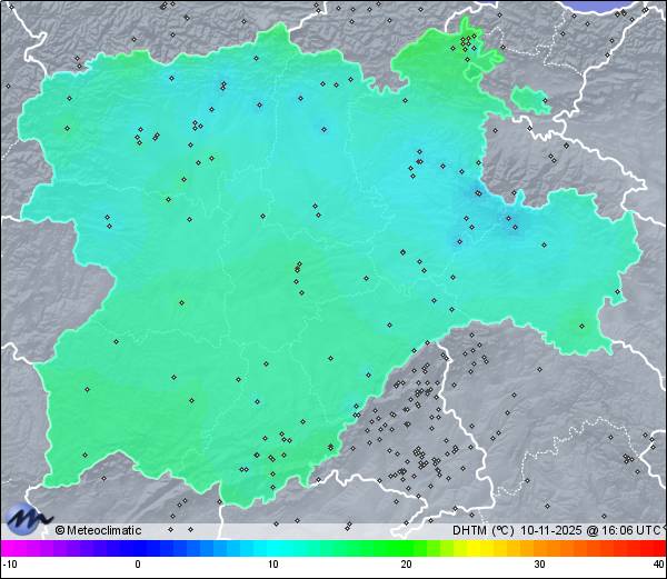 | Actualizado: 14:17 UTC | 9,3°C 83% | 10,6 °C / 92% | | 2,9°C / 77% | | 3 km/h SSE | | 23 km/h | | 1.019 hPa |