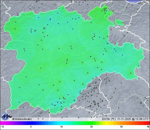 | Actualizado: 13:29 UTC | 12,6°C 71% | 12,6 °C / 97% | | 1,1°C / 71% | | 6 km/h E | | 11 km/h | | 1.013 hPa |