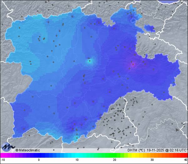 | Escarcha | | Actualizado: 00:56 UTC | -3,4°C 93% | -3,4 °C / 93% | | -4,7°C / 92% | | Calma | | 0 km/h | | 1.019 hPa |