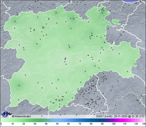| Actualizado: 00:17 UTC | 7,5°C 94% | 10,4 °C / 94% | | 7,3°C / 76% | | 3 km/h S | | 32 km/h | | 1.020 hPa | | 1,8 mm |
