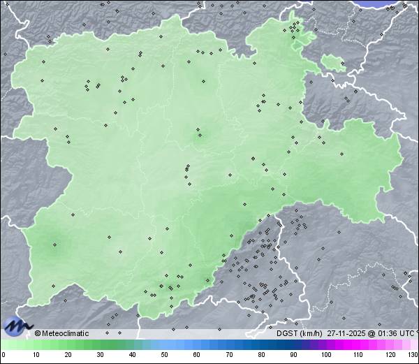 | Actualizado: 00:15 UTC | 9,8°C 87% | 9,8 °C / 88% | | 9,7°C / 86% | | Calma | | 9 km/h | | 1.026 hPa |