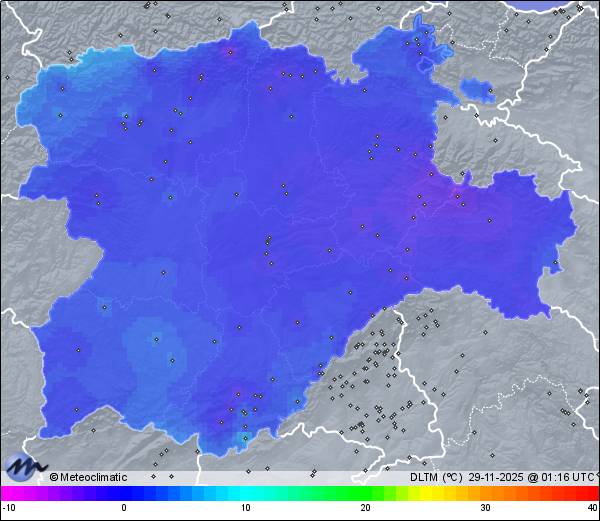 | Actualizado:28-11-2025 23:58 UTC | 6,3°C 76% | 14,0 °C / 82% | | 2,6°C / 49% | | Calma | | 13 km/h | | 1.023 hPa |