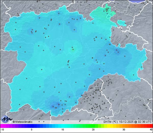 | Llueve | | Actualizado: 01:11 UTC | 9,5°C 95% | 9,9 °C / 96% | | 9,4°C / 94% | | Calma | | 2 km/h | | 1.024 hPa | | 1,3 mm |