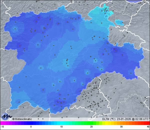 | Actualizado: 00:33 UTC | 6,3°C 86% | 6,3 °C / 87% | | 5,4°C / 86% | | 999 hPa |