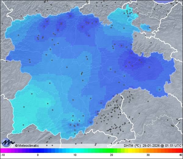 | Actualizado: 00:15 UTC | 5,3°C 95% | 6,6 °C / 97% | | 0,1°C / 85% | | Calma | | 28 km/h | | 1.003 hPa | | 0,8 mm |