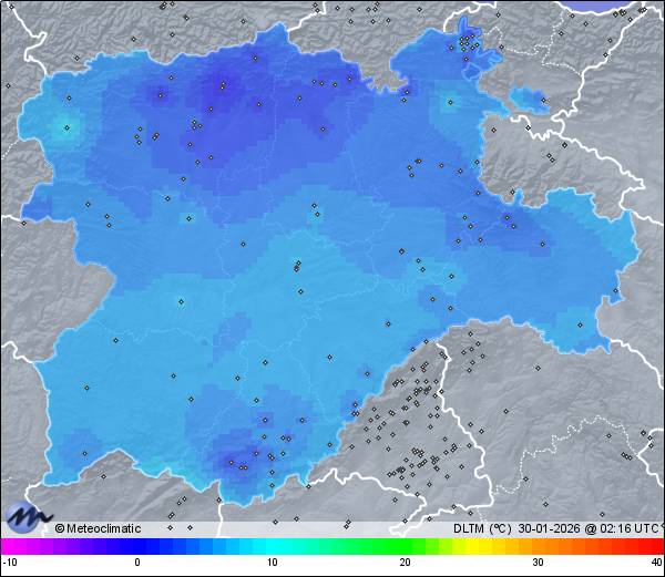 | Actualizado: 00:30 UTC | 5,1°C 89% | 5,3 °C / 90% |  | | 4,7°C / 88% | | Calma | | 4 km/h | | 1.012 hPa |