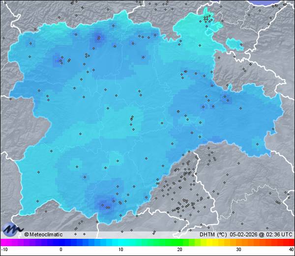 | Actualizado: 00:34 UTC | 6,6°C 83% | 6,7 °C / 83% | | 6,3°C / 82% | | 993 hPa |