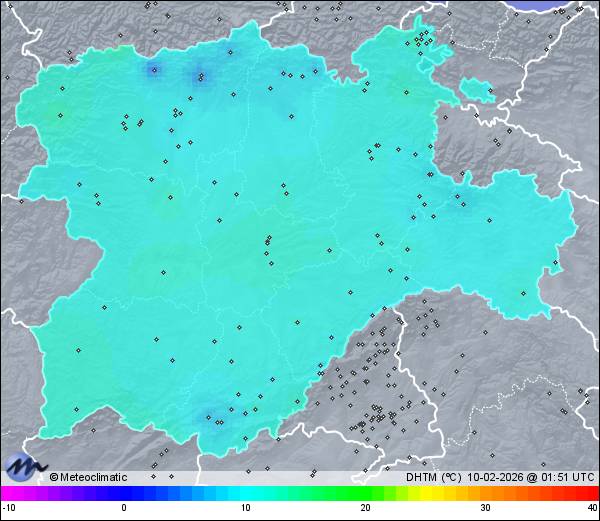 | Actualizado: 00:16 UTC | 9,7°C 95% | 9,8 °C / 95% |  | | 9,7°C / 94% | | 20 km/h WSW | | 30 km/h | | 1.010 hPa |