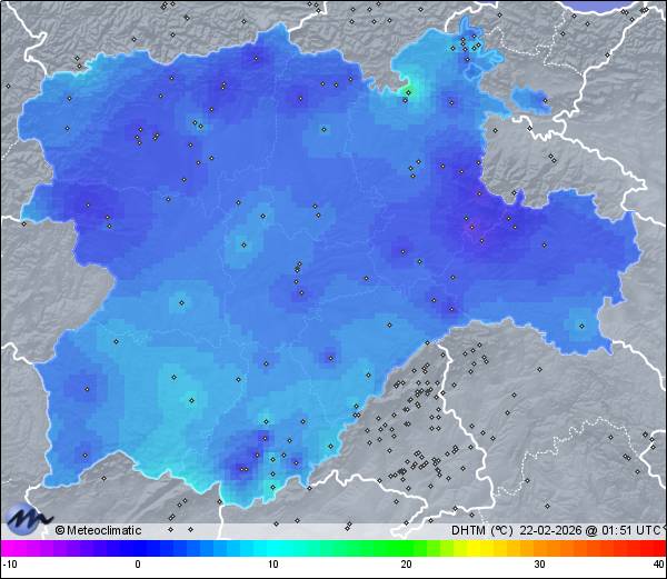 | Escarcha | | Actualizado: 00:11 UTC | -2,2°C 92% | -1,5 °C / 92% | | -2,3°C / 91% | | Calma | | 0 km/h | | 1.034 hPa |