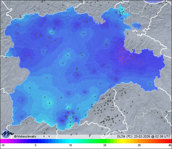 | Actualizado: 00:30 UTC | 4,8°C 83% | 5,8 °C / 84% | | 4,6°C / 79% | | Calma | | 11 km/h | | 1.028 hPa |