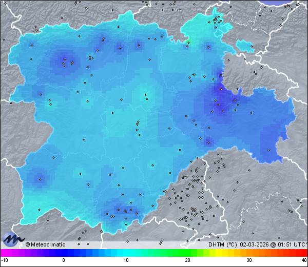 | Actualizado: 00:17 UTC | 9,7°C 81% | 9,9 °C / 82% | | 9,5°C / 80% | | 4 km/h ENE | | 11 km/h | | 1.021 hPa |