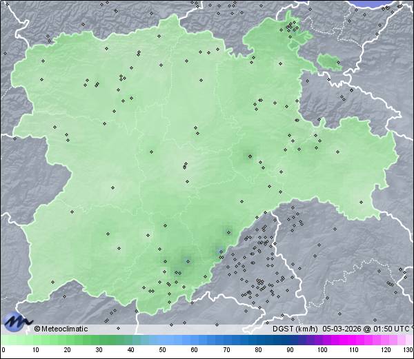 | Actualizado: 00:04 UTC | 7,6°C 84% | 17,4 °C / 89% | | 3,8°C / 53% | | Calma | | 29 km/h | | 1.015 hPa |