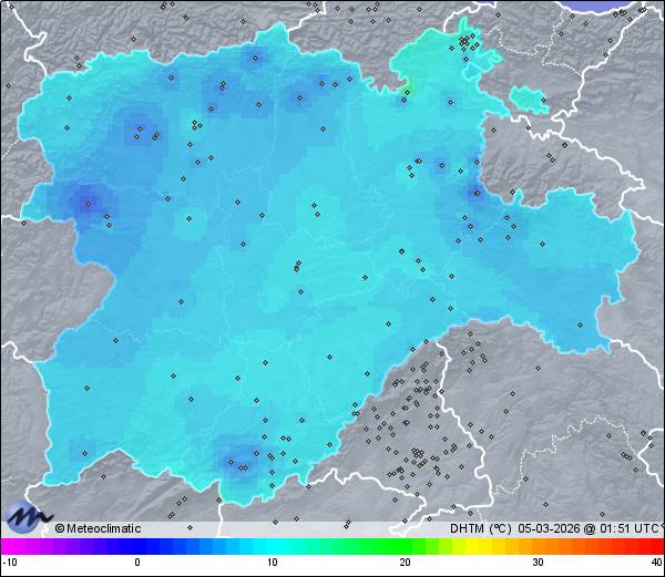 | Actualizado: 00:11 UTC | 9,4°C 87% | 10,9 °C / 87% | | 9,4°C / 83% | | Calma | | 3 km/h | | 1.013 hPa |
