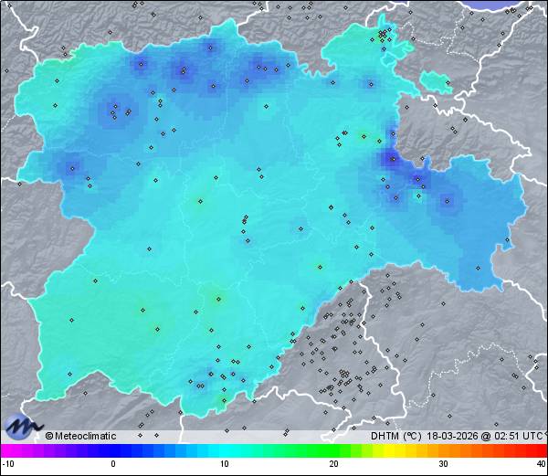 | Actualizado: 00:56 UTC | 7,0°C 66% | 9,1 °C / 66% | | 6,9°C / 55% | | 1 km/h NNE | | 3 km/h | | 1.010 hPa |