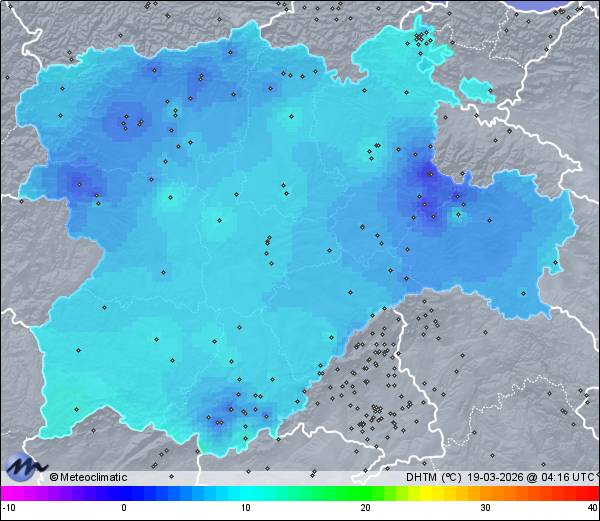 | Escarcha | | Actualizado: 01:35 UTC | -0,2°C 87% | 1,9 °C / 87% | | -0,3°C / 79% | | Calma | | 2 km/h | | 1.010 hPa |