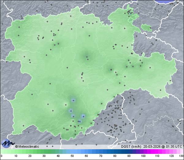 | Actualizado: 00:11 UTC | 10,7°C 75% | 18,6 °C / 97% | | 1,6°C / 35% | | 8 km/h ENE | | 23 km/h | | 1.010 hPa |