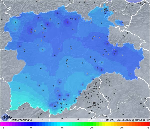 | Actualizado: 00:34 UTC | 3,0°C 78% | 4,0 °C / 82% | | 2,9°C / 78% | | Calma | | 7 km/h | | 1.021 hPa |