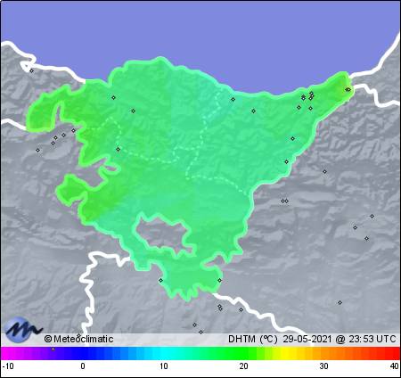 | 29-05-2021 | | | Máx. | Mín. | | | Temperatura | 19,2 | 15,8 | °C | | Humedad | 90 | 77 | % | | Viento | 27 | n/a | km/h | | Presión | 1.022 | 1.018 | hPa | | Precipitación | 0,0 | mm |