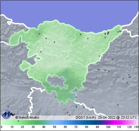 | 29-04-2022 | | | Máx. | Mín. | | | Temperatura | 18,2 | 12,3 | °C | | Humedad | 94 | 66 | % | | Viento | 23 | n/a | km/h | | Presión | 1.029 | 1.026 | hPa | | Precipitación | 0,0 | mm |