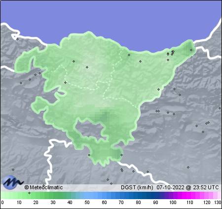 | 07-10-2022 | | | Máx. | Mín. | | | Temperatura | 23,9 | 12,5 | °C | | Humedad | 97 | 60 | % | | Viento | 29 | n/a | km/h | | Presión | 1.026 | 1.021 | hPa | | Precipitación | 0,0 | mm |