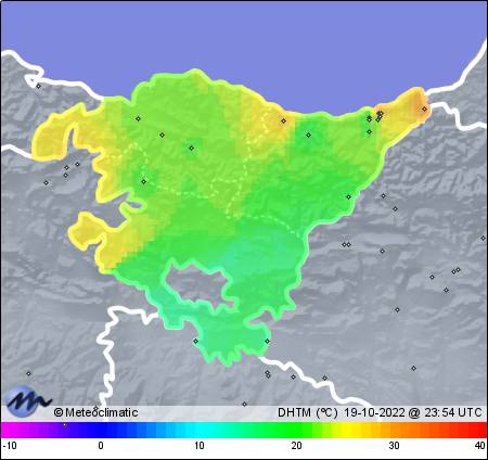 | 19-10-2022 | | | Máx. | Mín. | | | Temperatura | 29,9 | 17,1 | °C | | Humedad | 99 | 75 | % | | Viento | 10 | n/a | km/h | | Presión | 1.020 | 1.020 | hPa | | Precipitación | 0,6 | mm |