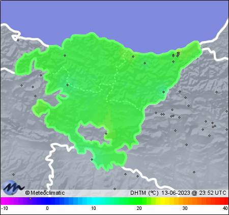 | 13-06-2023 | | | Máx. | Mín. | | | Temperatura | 22,5 | 17,2 | °C | | Humedad | 92 | 73 | % | | Viento | 46 | n/a | km/h | | Presión | 1.014 | 1.010 | hPa | | Precipitación | 23,8 | mm |