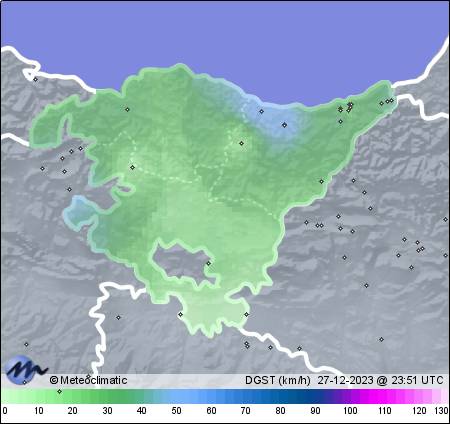 | 27-12-2023 | | | Máx. | Mín. | | | Temperatura | 18,9 | 11,1 | °C | | Humedad | 51 | 30 | % | | Viento | 66 | n/a | km/h | | Presión | 1.021 | 1.016 | hPa | | Precipitación | 0,0 | mm |