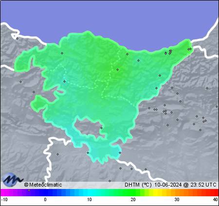 | 10-06-2024 | | | Máx. | Mín. | | | Temperatura | 19,7 | 12,7 | °C | | Humedad | 94 | 54 | % | | Viento | 22 | n/a | km/h | | Precipitación | 0,0 | mm |