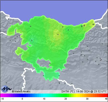 | 14-08-2024 | | | Máx. | Mín. | | | Temperatura | 23,2 | 17,7 | °C | | Humedad | 99 | 63 | % | | Viento | 33 | n/a | km/h | | Presión | 1.025 | 1.018 | hPa | | Precipitación | 14,0 | mm |