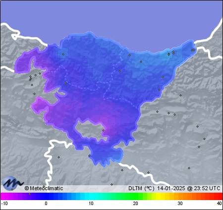 | 14-01-2025 | | | Máx. | Mín. | | | Temperatura | 9,6 | 3,9 | °C | | Humedad | 82 | 67 | % | | Viento | 14 | n/a | km/h | | Presión | 1.035 | 1.032 | hPa | | Precipitación | 0,0 | mm |