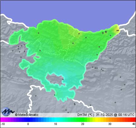 | Act. | Máx. | Mín. | Act. | Máx. | Mín. | Act. | Máx. | Mín. | Act. | Máx. | Hoy | Año |  |  | Irún Azken Portu | 11 | n/a | 24,7 | 11,7 | n/a | 97 | 55 | n/a | 1.013 | 1.008 | n/a | 16 | 0,2 | 1.032,6 |  |  |  | Irún | 37 | n/a | 23,5 | 11,6 | n/a | 96 | 57 | n/a | 1.014 | 1.009 | n/a | 26 | 1,4 | 1.126,4 |  |  |  | Donostia - S.Izpizua | 38 | n/a | 24,1 | 12,9 | n/a | 92 | 48 | n/a | 1.013 | 1.008 | n/a | 24 | 0,8 | 979,4 |  |  |  | San Sebastián - Ibaeta | 54 | n/a | 24,3 | 11,6 | n/a | 94 | 52 | n/a | 1.013 | 1.008 | n/a | 47 | 0,6 | 1.103,6 |  |  |  | Donostia - Ulia | 61 | n/a | 24,4 | 12,5 | n/a | 98 | 49 | n/a | 1.015 | 1.010 | n/a | 30 | 1,1 | 912,6 |  |  |  | Donostia - Polloe | 72 | n/a | 23,9 | 11,9 | n/a | 95 | 54 | n/a | 1.013 | 1.008 | n/a | 34 | 1,6 | 1.007,0 |  |  |  | San Sebastián - Arriola | 75 | n/a | 23,1 | 12,1 | n/a | 92 | 49 | n/a | 1.011 | 1.007 | n/a | 39 | 0,8 | 1.062,8 |  |  |  | Mutriku | 80 | n/a | 22,6 | 11,9 | n/a | 84 | 57 | n/a | 1.011 | 1.007 | n/a | 48 | 0,4 | 725,6 |  |  |  | Tolosa | 90 | n/a | 23,2 | 11,4 | n/a | 86 | 51 | n/a | 1.011 | 1.007 | x | x | - | 1.048,6 |  |  |  | Oiartzun | 110 | n/a | 23,5 | 10,5 | n/a | 86 | 52 | n/a | 1.012 | 1.008 | n/a | 11 | - | 1.154,6 |  |  |  | Arroagoikoa-Zestoa | 135 | n/a | 21,1 | 11,9 | n/a | 95 | 56 | n/a | 1.012 | 1.006 | n/a | 71 | 0,2 | 919,2 |  |  |  | Eibar - Centro | 145 | n/a | 20,8 | 11,6 | n/a | 99 | 57 | n/a | x | x | n/a | 13 | - | 43,9 |  |  |  | Abaltzisketa | 345 | n/a | 21,3 | 10,4 | n/a | 88 | 58 | n/a | 1.019 | 1.015 | n/a | 47 | - | 795,0 |  |