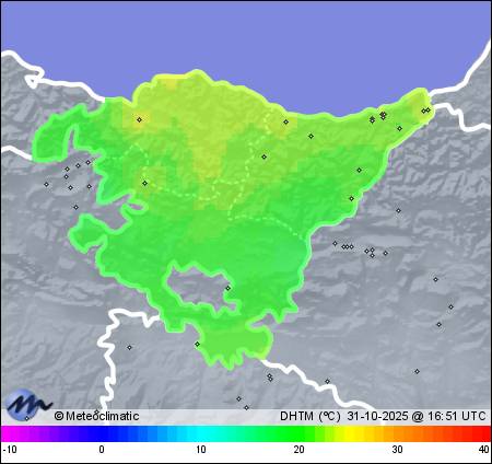 | Act. | Máx.  | Mín. | Act. | Máx. | Mín. | Act. | Máx. | Mín. | Act. | Máx. | Hoy | Año |  |  | Donostia - S.Izpizua | 38 | 21,7 | 21,7 | 18,2 | 48 | 63 | 48 | 1.011 | 1.012 | 1.010 | 5 SE | 21 | - | 979,4 |  |  |  | Donostia - Ulia | 61 | 21,5 | 21,5 | 17,9 | 51 | 65 | 49 | 1.013 | 1.014 | 1.012 | 8 SE | 30 | - | 912,6 |  |  |  | San Sebastián - Ibaeta | 54 | 21,4 | 21,4 | 16,9 | 52 | 70 | 52 | 1.011 | 1.012 | 1.010 | 23 S | 52 | - | 1.103,6 |  |  |  | Donostia - Polloe | 72 | 21,1 | 21,1 | 17,3 | 52 | 69 | 52 | 1.011 | 1.012 | 1.010 | 8 ENE | 34 | - | 1.007,0 |  |  |  | Mutriku | 80 | 21,0 | 21,1 | 18,8 | 58 | 60 | 55 | 1.009 | 1.009 | 1.008 | 14 WNW | 45 | - | 725,6 |  |  |  | Irún Azken Portu | 11 | 20,8 | 20,8 | 14,9 | 59 | 86 | 57 | 1.011 | 1.012 | 1.010 | 6 SW | 32 | - | 1.032,6 |  |  |  | San Sebastián - Arriola | 75 | 20,8 | 20,8 | 17,6 | 48 | 59 | 47 | 1.010 | 1.010 | 1.009 | 13 S | 42 | - | 1.062,8 |  |  |  | Arroagoikoa-Zestoa | 135 | 20,7 | 20,7 | 18,9 | 54 | 57 | 52 | 1.010 | 1.010 | 1.008 | 26 WSW | 68 | - | 919,2 |  |  |  | Eibar - Centro | 145 | 20,5 | 20,6 | 16,5 | 52 | 68 | 49 | x | x | x | 5 NE | 15 | - | 43,9 |  |  |  | Irún | 37 | 20,1 | 20,1 | 16,1 | 57 | 75 | 55 | 1.012 | 1.013 | 1.011 | 13 SSW | 45 | - | 1.126,4 |  |  |  | Tolosa | 90 | 20,1 | 20,1 | 17,2 | 53 | 66 | 49 | 1.011 | 1.011 | 1.009 | x | x | - | 1.048,6 |  |  |  | Oiartzun | 110 | 19,7 | 19,7 | 17,7 | 57 | 67 | 56 | 1.011 | 1.011 | 1.010 | - | 14 | - | 1.154,6 |  |  |  | Abaltzisketa | 345 | 18,7 | 19,1 | 17,1 | 56 | 64 | 53 | 1.019 | 1.019 | 1.017 | 18 WSW | 63 | - | 795,0 |  |