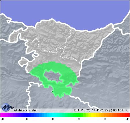 | Llueve | | Actualizado: 01:43 UTC | 14,1°C 83% | 17,1 °C / 86% | | 14,0°C / 70% | | 1 km/h NW | | 26 km/h | | 1.002 hPa | | 0,5 mm |