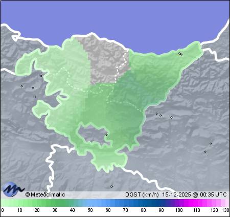 | Actualizado: 16:30 UTC | 14,5°C 64% | 15,7 °C / 88% | | 8,7°C / 60% | | 10 km/h E | | 35 km/h | | 1.018 hPa |