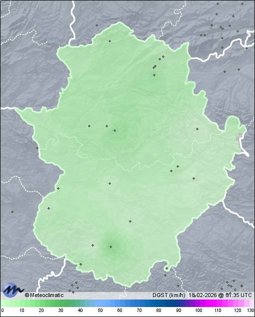 | Actualizado:17-02-2026 23:58 UTC | 11,7°C 80% | 16,1 °C / 96% | | 9,4°C / 65% | | 5 km/h S | | 37 km/h | | 1.024 hPa |